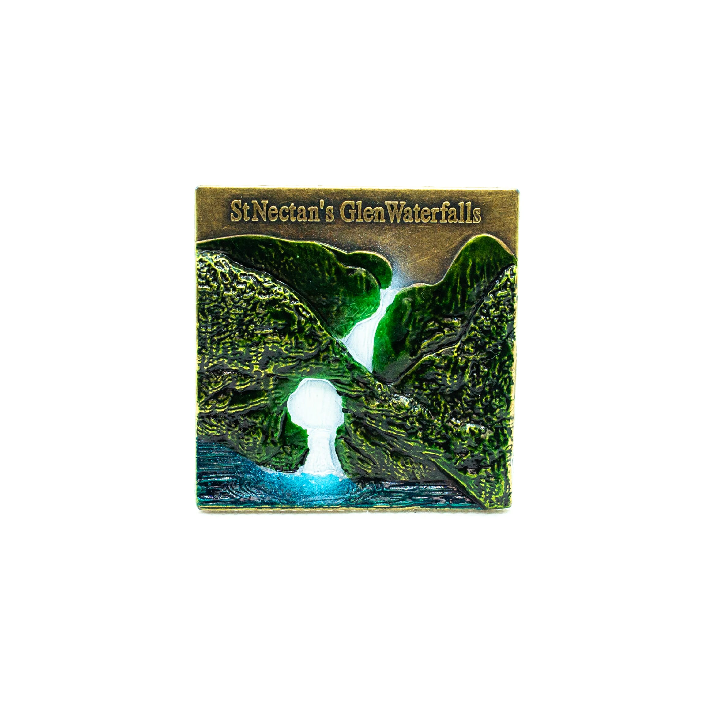 The magnet shows a representation of the main waterfall and kieve at St Nectan’s Glen.
